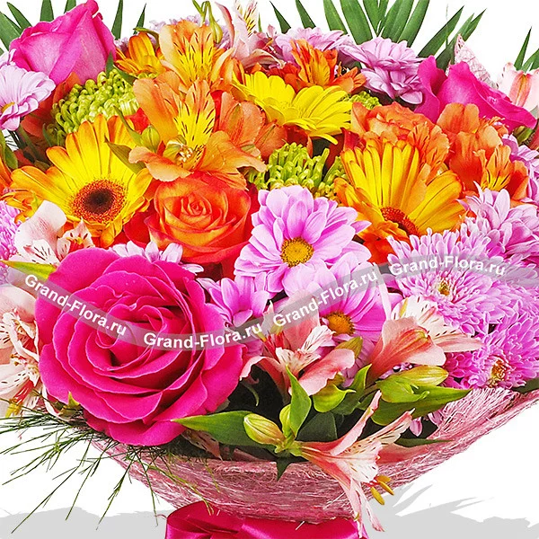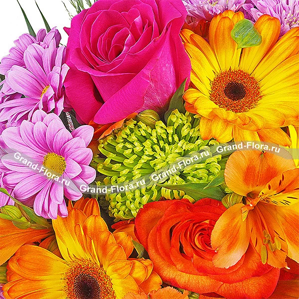Сочетание всех цветов радуги собраны в этом прекрасном букете. Такой букет можно подарить бизнес леди, преподнести его на юбилей статному мужчине или удивить свою девушку. Радовать такой букет будет не меньше 7 дней*.