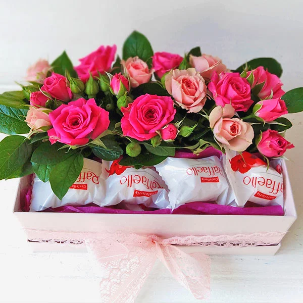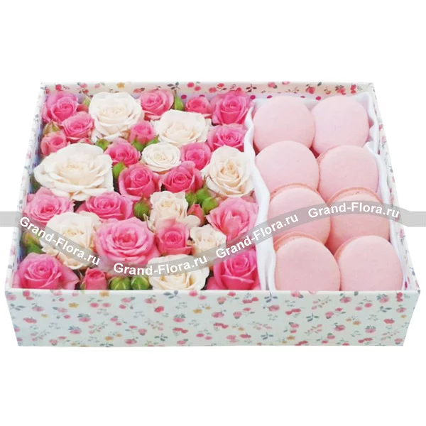 Уменьшенный: роза кустовая розовая - 2 шт., роза кустовая белая - 1 шт., макаруны (возможна замена на зефир), декор, оазис, коробка малая.