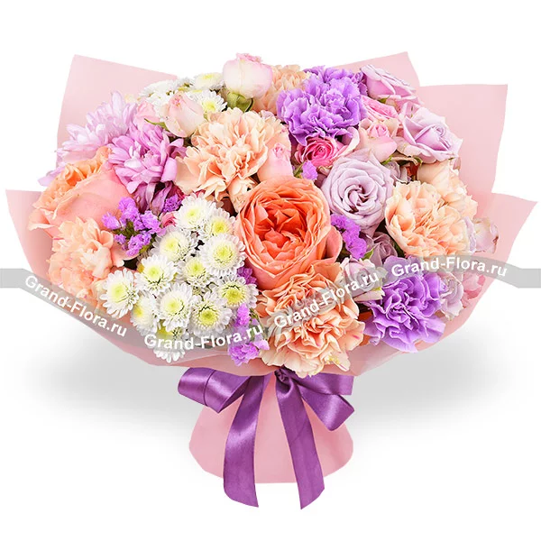 Уменьшенный: роза персиковая - 1 шт.,гвоздика персиковая - 3 шт., гвоздика фиолетовая - 1 шт., роза кустовая розовая - 1 шт., роза кустовая фиолетовая - 1 шт., хризантема кустовая ромашковая фиолетовая - 1 шт., хризантема сантини - 1 шт., статица, упаковка, лента. Примерный размер: 25Х25 см.