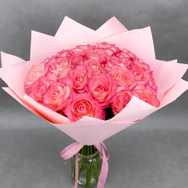 роза розовая - 25 шт., упаковка, лента. Оттенок роз может отличаться от представленного на фото